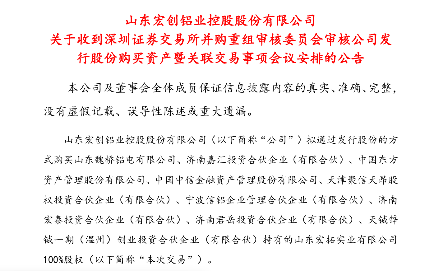 交易核心信息 - 宏创控股发行股份购买宏拓实业100%股权的交易将于2025年12月10日由深交所并购重组委审核 [1] - 本次交易作价约为635.18亿元,构成关联交易 [4] - 标的资产宏拓实业股东全部权益评估值为635.18亿元,较账面价值增值207.78亿元,增值率为48.62% [4] 交易结构与规模 - 交易对方包括魏桥铝电、嘉汇投资、东方资管等九方,其中魏桥铝电系公司控股股东山东宏桥的全资子公司 [4] - 标的公司宏拓实业是全球领先的铝产品制造商,成立于2016年 [4] - 截至2025年5月31日,标的公司总资产达1127.24亿元,而宏创控股总资产仅30.23亿元,交易呈现“蛇吞象”特征 [4] 标的公司财务状况与关注点 - 报告期(2023年至2024年)内,标的资产存在客户与供应商重叠的情况,公司解释系基于行业集中度、降低交易成本及业务需求等商业合理性原因 [4][5] - 报告期各期末,标的公司有息负债规模大幅增长:短期借款余额分别为167.83亿元和197.78亿元,一年内到期的长期借款余额分别为65.39亿元和74.66亿元,长期借款余额分别为31.13亿元和69.52亿元 [5] - 标的公司流动比率、速动比率低于同行业可比公司平均水平,资产负债率远高于同行业可比公司平均水平 [5] - 公司解释高负债率主要因报告期内进行沾化氧化铝及云南电解铝产能建设存在资金需求,凭借良好资信获取了匹配的债务融资 [6] 交易对上市公司的影响 - 交易完成后,公司将从单一铝深加工业务转型为集电解铝、氧化铝及铝深加工的全产业链一体化公司 [7] - 交易将显著提升公司在产品品类、生产规模、技术水平及人才储备等方面的实力 [7] - 交易后公司总资产、净资产、营业收入及净利润等关键财务指标将显著增长,总资产及收入规模突破千亿元,跻身全球特大型铝业生产企业之列 [7] - 交易完成后,上市公司资产负债率将从交易前的38.58%上升至54.89% [6] 公司近期经营与市场表现 - 近年来公司业绩承压:2023年净亏损1.45亿元,2024年净亏损6898.18万元 [6] - 2025年前三季度,公司实现营收20.26亿元,同比减少20.82%;归母净利润为-1.7亿元,同比暴跌231.93% [6] - 二级市场上,截至12月3日收盘,公司股价报21.92元/股,当日上涨6.82%,总市值249.1亿元 [8] - 公司股价年内涨幅达144.37% [8]