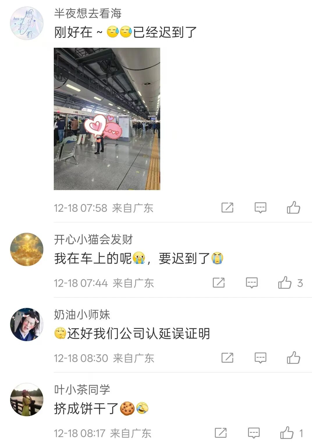 12月18日上午, 有多位深圳市民发帖称 "原本30分钟到,结果要迟到。" 半夜想去看海 刚好在 ~ ☺ ③已经迟到了 深圳地铁11号线出故障, 12-18 07:58 来自广东 [7] l --- 开心小猫会发财 我在车上的呢, 要迟到了 1 [7] B r 4 3 12-18 07:44 来自广东 奶油小师妹 3还好我们公司认延误证明 [7] 12-18 08:30 来自广东 l-- 叶小茶同学 挤成饼干了236 E 12-18 08:17 来自广东 --- 1 套装 2 min A Cam 休而州P N W 又是11号线 12-18 08:15 来自广东 Shallvbaby- 票务手续是退款嘛 12-18 08:33 来自广东 E 日 172 ta0126 请问机场北还有空车来吗 12-18 08:11 来自广东 | | | | E 日 175 caaaaaaai等人 共4条回复 > 你快乐哇 又是11号线 © 日 172 12-18 08:19 来自广东 E 简单小可爱本主 可我还没上车呀,太多人了,排不上去。 12-18 08:15 来自广东 …… 躺在云朵的喵叽等人 共3条回复 > 花里胡哨安陵 ...