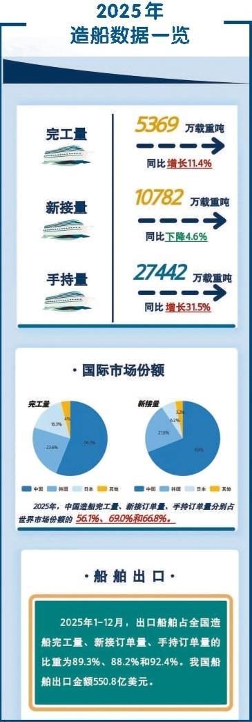 行业核心表现 - 2025年中国造船业三大指标继续领跑全球,连续16年保持世界第一 [2] - 全年造船完工量5369万载重吨,占世界总量的56.1% [2] - 新接订单量10782万载重吨,占世界总量的69.0% [2] - 手持订单量27442万载重吨,占世界总量的66.8%,再创新高 [2] 市场与订单结构 - 国际船东明显回流中国市场,2025年出口船舶分别占全国造船完工量、新接订单量和手持订单量的89.6%、89.5%和93.2% [5] - 这意味着中国每建造10艘船,就有近9艘将服务于全球航运市场 [5] - 2025年有6家中国造船企业位居世界造船完工量、新接订单量和手持订单量前10强 [17] 竞争力驱动因素:效率与成本 - 交付效率高,例如卡塔尔能源“百船计划”中,沪东中华交付LNG船“几乎每个月陆续能到船”,效率远超预期 [5] - 综合性价比高,在同等技术水平下,中国造船的总建造成本最低;在同等价格下,中国造船的交付能力和可靠性最强 [7] - 例如沪东中华“长恒”系列LNG运输船蒸发率控制在0.085%以内,为客户节省运营成本 [7] 竞争力驱动因素:产业链与制造体系 - 全产业链的系统性竞争力是关键支撑,中国是全世界唯一拥有联合国产业分类中全部工业门类的国家,制造业增加值占全球比重30% [8] - 强大的产业配套能力和综合成本优势,能够在全球供应链动荡时保障零部件供应和生产节奏 [8] - 在长三角等基地形成高效产业集群,上下游企业紧密协作,降低物流和生产成本 [12] - 已构建起完整且自主可控的从核心零部件、标品到解决方案的全供应链体系 [11] 技术与创新升级 - AI与实际场景深度融合,例如外高桥造船使用AI调度算法,使薄板生产车间产能提升了25% [9] - 绿色转型赢得市场先机,2025年多型世界级绿色智能船舶交付,高端转型取得重要突破 [10] - 例如交付全球首艘24000TEU级LNG双燃料动力超大型集装箱船,以及全球首艘风帆助推阿芙拉型成品油船,后者在理想海况下可实现日均节约燃油14.5吨 [11] 产品结构高端化突破 - 从以散货船、油轮等中低端船型为主,到在LNG运输船、大型集装箱船、汽车运输船等高端船型领域全面突破 [15] - 18种主要船型中有16种新接订单量位居世界第一 [15] 行业地位与全球影响 - 中国从最大的船舶消费国转变为服务全球的最大船舶供给国,标志着制造业从“规模优势”向“体系优势”跃升 [13] - 中国船舶集团成为全球最大造船上市公司,手持订单量占全球18%,生产排期延伸至2029年 [17] - 船舶出口高增长带动了钢铁、机械、电子、化工等数十个上下游行业协同发展,是制造业产业链的集体“出海” [18] - 手持订单饱满,排期已至2028年甚至更长,为行业提供了稳定预期,使企业有底气投入资源进行技术升级和产品优化 [18]