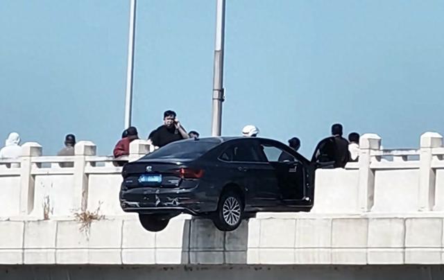 轿车撞断护栏半悬桥上,危急时刻他压车救人