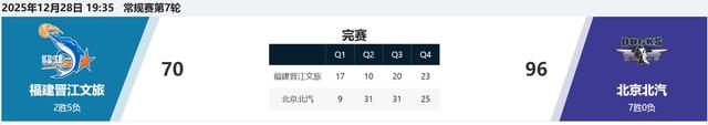 北京北汽队近期比赛表现 - 在2025至2026赛季CBA常规赛第七轮比赛中,北京北汽队在客场以96比70战胜福建队,继续保持不败战绩 [1] - 新赛季开赛前六轮,北汽队与广东队是两支保持全胜的球队,并列积分榜榜首 [2] - 比赛首节北汽队进入状态较慢,只得到9分并出现8次失误,以9比17落后,这是本赛季开赛至今北汽队打得最糟糕的第一节 [2] - 北汽队在第二节用了不到4分钟时间完成反超,单节净胜21分,半场以40比27领先 [2] - 下半场北汽队加快攻防速度扩大分差,外线攻击群屡屡投进三分球,最终比赛名单中的12名球员都得到了出场机会 [4] 球队阵容与伤病情况 - 在高强度、高密度的联赛中,球员伤病问题逐渐显现 [2] - 有伤在身的丘天至今还未有过出场记录,周琦因腰伤在上一场休战,陈盈骏又因鼻梁受伤在本场缺阵 [2] 对手分析与历史交锋 - 福建队以年轻球员为主,实力与北汽队存在差距,但近几个赛季有过爆冷击败北汽队的先例 [2] 未来赛程展望 - 北汽队下周赛程难度很大,跨年的三场比赛场场是硬仗 [4] - 周二北汽队将在主场迎战上赛季冠军浙江方兴渡队 [4] - 新年元旦夜,北汽队将与广东队进行直接对抗 [4] - 时隔一天,球队将奔赴客场与浙江方兴渡队进行本赛季第二回合的比赛 [4]