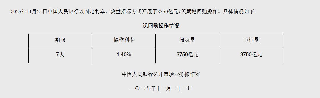 编辑:董文博 11月21日央行开展3750亿元7天期逆回购操作 中新网11月21日电 据央行网站消息,2025年11月21日中国人民银行以固定利率、数量招标方式开展了3750亿元7天期逆回购操作。具体情况如下: | 期限 | 操作利率 | 投标量 | 中标量 | | --- | --- | --- | --- | | 7天 | 1.40% | 3750亿元 | 3750亿元 | | | 中国人民银行公开市场业务操作室 | | | | | 二〇二五年十一月二十一日 | | | | 国新闻网 立博 | | | | 来源:中国新闻网 广告等商务合作,请点击这里 本文为转载内容,授权事宜请联系原著作权人 中新经纬版权所有,未经书面授权,任何单位及个人不得转载、摘编或以其它方式使用。 关注中新经纬微信公众号(微信搜索"中新经纬"或"jwview"),看更多精彩财经资讯。 ...