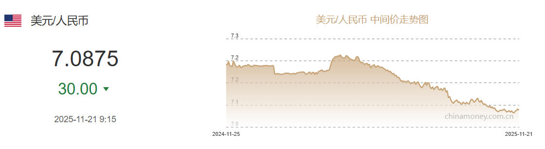 11月21日人民币对美元中间价报7.0875元 上调30个基点