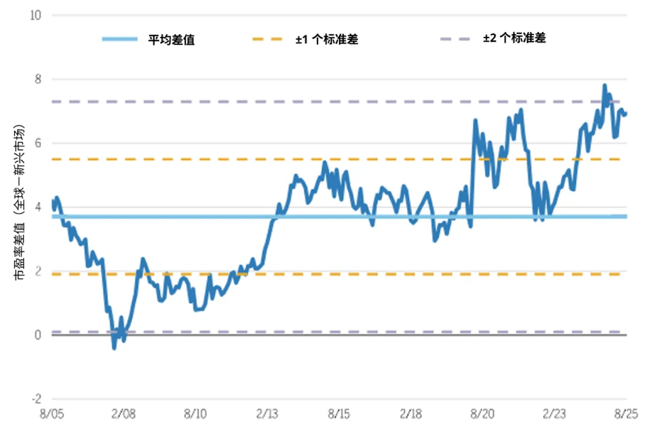 图1:市盈率差值显示新兴市场股价相对便宜 (资料来源:威灵顿投资管理、MSCI、Refinitiv|月度数据范围:2005年7月1日至2025年8月29日) 图1以市盈率(P/E)差值为衡量标准,展示了发达市场与新兴市场股票的相对价值。当前的市盈率差值几乎高出其20年历史平 均水平近两个标准差。这表明,相较于发达市场,新兴市场或仍被低估。因此,尽管新兴市场近期表现强劲,当下可能依然是具有 吸引力的入场时机。 图2:相对资金流差值——新兴市场基金vs美国基金 (资料来源:威灵顿投资管理、Morningstar Direct|美国注册的公募基金及ETF每日净流入与资产管理规模数据,时间范围:2020年7月1日至 2025年8月29日|新兴市场包括以下Morningstar 分类: 中国区、多元新兴市场、印度股票、拉丁美洲股票、以及太平洋/亚洲(除日本外) 股票。该图为每日净流量按资产规模调整后的45日移动平均值) 过去三年中,新兴市场股票基金的资金净流入量相较于其资产管理规模而言,一直落后于美国同类基金。2025年新兴市场股票 的强劲表现(虽部分受益于美元走弱,但不能完全归因于此)显示出潜在的反转迹象。如图2所示 ...