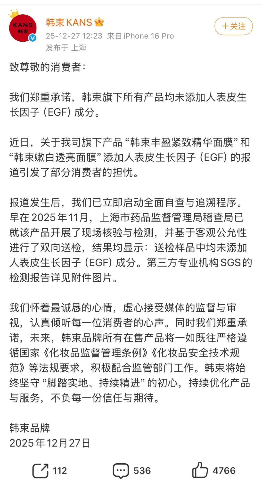 公司股价与市场反应 - 公司股价在12月29日至30日两个交易日内跌幅超过15% [1] - 12月29日股价盘中一度跌至57港元,跌幅超33%,收盘报74.05港元,单日跌幅13.19% [1] - 为应对股价暴跌,公司执行董事罗燕于12月29日斥资约2744万港元增持,平均价格约75.46港元/股 [1] 产品安全与舆论危机 - 央视报道指出公司核心品牌韩束旗下“丰盈紧致精华面膜”与“嫩白透亮面膜”两款产品被检测出含有禁用原料表皮生长因子(EGF),含量分别为0.07pg/g和3.21pg/g [2] - 报道播出后,韩束将涉事产品从各大电商平台下架,并发布声明称所有产品均未添加EGF成分 [2] - 公司表示上海市药监局已于2025年11月进行现场核验与双向送检,结果均显示未添加EGF [2] - 此次事件引发消费者在黑猫投诉平台密集要求退货退款,质疑公司送检与销售产品不一致 [4] - 此次并非韩束首次被曝非法添加,去年10月其产品曾被检出存在未经备案和标注的防腐剂成分 [9] 品牌表现与收入结构 - 韩束是公司的核心品牌,2025年上半年为公司贡献收入33.44亿元,占总收入的81.4%,同比增长14.3% [10] - 报告期内,韩束红蛮腰系列全渠道累计销售1500万套,X肽系列累计销售额突破2亿元 [10] - 公司线上自营渠道收入在2025年上半年达34.21亿元,同比增长24.6%,收入占比从78.4%提升至83.3% [10] 营销策略与费用结构 - 公司自2023年起抓住短剧风口,与网红姜十七合作投资五部短剧并植入产品,当年韩束实现营收近31亿元,收入占比从47.4%大幅提升至73.7% [10] - 公司持续加码短剧营销并推出低价套装以撬动下沉市场 [11] - 公司销售费用率从2022年的47.01%攀升至2025年上半年的56.88%,其中2024年高达58.11% [11] - 同期,公司研发费用率从2022年的4.12%下降至2025年上半年的2.51% [11] - 公司创始人曾表示“不打广告,很难做成品牌”,并称公司策略是哪个品类被市场接受就做哪个,而非打造大单品 [11] 增长挑战与战略调整 - 随着直播红利空间缩窄,韩束品牌增速已明显放缓 [12] - 公司决定将战略重心向韩束以外的品牌倾斜,2026年其他品牌的目标销售额为税前43.6亿元 [12] - 具体目标包括:NEW PAGE一页品牌目标20亿元,安敏优目标6亿元,极方等品牌目标数倍增速 [12] - 然而,NEW PAGE一页品牌在2025年上半年收入仅为3.97亿元,2024年全年收入约3.76亿元,与2026年目标差距巨大 [13]