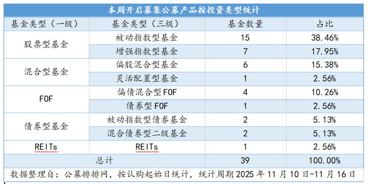 "11月公募发行市场持续回暖,核心源于多方面积极因素。"排排网集团旗下融智投资FOF基金经理 李春瑜表示,一方面,A股市场环境改善,权益类基金业绩显著回升,赚钱效应直接点燃投资者热情, 成为发行回暖的核心引擎。另一方面,在资管产品净值化背景下,居民财富管理观念正从单一储蓄转向 专业配置,对公募基金这类规范、透明的工具青睐有加,构成了市场扩张的坚实基底。 此外,李春瑜还指出,监管层推动费率改革、管理人跟投机制强化了利益共担,叠加渠道持续拓 宽,也显著提升了公募基金的制度竞争力。 本周28只权益基金启动募集,包括22只股票型基金和6只偏股型混合基金,占总量的71.79%。从细 分品类来看,股票型基金发行表现尤为强劲。本周共有22只股票型新基启动募集,占全市场发行总量的 56.41%,成为发行主力。其中,被动指数型基金发行15只,占比38.46%,凭借紧贴市场、费率低的优 势,成为资金抢筹指数行情的首选;增强指数型基金发行7只,占比17.95%,通过主动管理力求超额收 益,精准满足了部分投资者的差异化需求。 混合型基金发行节奏平稳,共推出7只新基,占全市场发行总量的17.95%。其中,偏股混合型基金 是绝对核心,发 ...