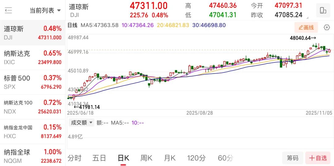 经济数据方面,周三发布的ADP私人就业数据优于预期,ISM服务业经济读数也强于预期。数据显示,10月增加了42000个工作岗位,超过了道琼斯普遍 预期的增加22000个。而9月的就业数据从减少29000个岗位修正为减少了3000个工作岗位。 航空股多数上涨,波音跌0.23%,美国航空涨超6%,达美航空涨逾5%,西南航空涨超6%,美联航涨逾6%。 海川证券收涨超620%。公开资料显示,公司是2015年6月创立、2019年1月在纳斯达克上市的资产管理集团,以投资银行、资产管理等业务为核心,在美 国及香港持有证券经纪、资产管理和投资银行牌照,接受美国SEC、FINRA及香港金融管理局等多地监管机构的监管。 消息面上,当地时间11月5日,美国最高法院就美国总统特朗普大规模征收关税的合法性展开辩论。此案被视为对特朗普总统权力边界及其能否扩大行政 权限的重要考验,并可能对全球经济产生影响。 当地时间11月5日,美股三大股指集体收涨。道指收涨225.76点,报47311点,涨幅为0.48%;纳指收涨151.16点,报23499.8点,涨幅为0.65%;标普500指 数收涨24.74点,报6796.29点,涨幅为0.37%。 ...