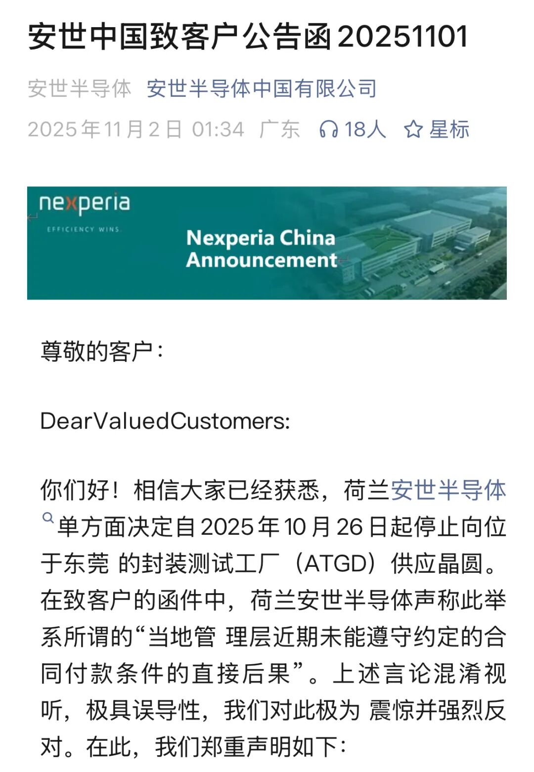11月2日凌晨,安世半导体中国有限公司发布致客户公告函。 安世中国致客户公告函 20251101 安世半导体 安世半导体中国有限公司 2025年11月2日 01:34 广东 6 18人 ☆ 星标 Nexperia China Announcement 尊敬的客户: DearValuedCustomers: 你们好! 相信大家已经获悉,荷兰安世半导体 °单方面决定自 2025 年 10 月 26 日起停止向位 于东莞 的封装测试工厂(ATGD)供应晶圆。 在致客户的函件中,荷兰安世半导体声称此举 系所谓的"当地管 理层近期未能遵守约定的合 同付款条件的直接后果"。上述言论混淆视 听,极具误导性,我们对此极为 震惊并强烈反 对。在此,我们郑重声明如下: (文章来源:国际金融报) 相信大家已经获悉,荷兰安世半导体单方面决定自2025年10月26日起停止向位于东莞的封装测试工厂(ATGD)供应晶圆。在致客户的函件中,荷兰安世 半导体声称此举系所谓的"当地管理层近期未能遵守约定的合同付款条件的直接后果"。上述言论混淆视听,极具误导性,我们对此极为震惊并强烈反对。 在此,我们郑重声明如下: 1. 荷兰安世半导体所谓"当地 ...