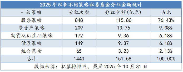 | 2025年以来不同策略私募基金分红金额统计 | | | | | --- | --- | --- | --- | | 一级策略 分红次数 -- 分红金额(亿元) | | | 占比 | | 股票策略 | 848 | 115. 86 | 76. 43% | | 多资产策略 | 209 | 13. 76 | 9.08% | | 期货及衍生品策略 | 172 | 9.36 | 6. 18% | | 债券策略 | 149 | 9.37 | 6. 18% | | 组合基金 | 65 | 3.23 | 2. 13% | | 总计 | 1443 | 151.58 | 100. 00% | | 数据来源:私募排排网,截至2025年10月31日 | | | | 从管理模式来看,主观私募与量化私募的分红积极性呈现明显分化。其中,主观私募产品今年以来 分红达943次,分红金额100.42亿元,占比66.25%;而量化私募产品尽管今年业绩表现抢眼,分红金额 却仅为51.16亿元,占比33.75%,分红金额约为主观产品的一半。 从私募机构规模来看,百亿私募的分红主导地位显著。截至2025年10月31日,100亿元以上规模私 募旗下产品 ...