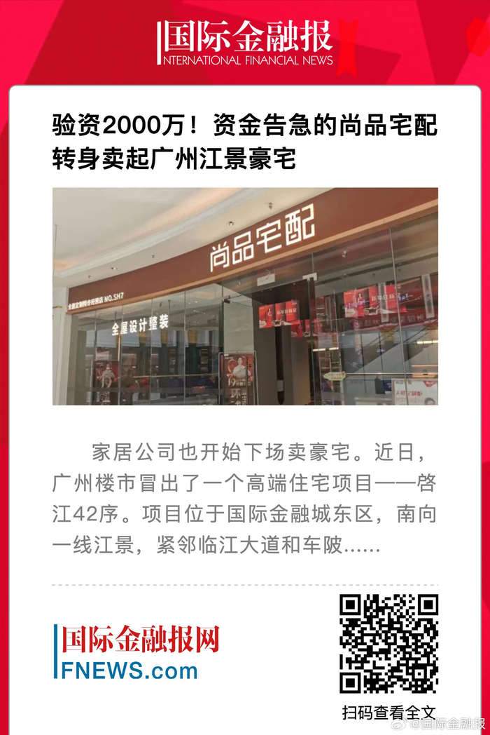 家居公司也开始下场卖豪宅。近日, 广州楼市冒出了一个高端住宅项目 -- 啓 江42序。项目位于国际金融城东区,南向 一线江景,紧邻临江大道和车陂 ...... 国际金融报网 FNEWS.com 扫码查看全不同制 bt Cam H 验资2000万! 资金告急的尚品宅配 转身卖起广州江景豪宅 【验资2000万!资金告急的尚品宅配转身卖起广州江景豪宅】 ...