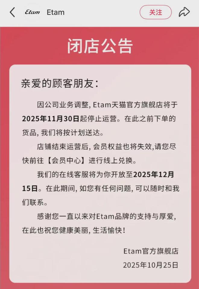 公司近期动态 - 法国服饰品牌艾格(Etam)宣布其天猫官方旗舰店于11月30日停止运营 小红书和抖音店铺也同步关闭[1] - 此次关闭的线上店铺为内衣业务店 这意味着进入中国市场31年的艾格或将彻底退出[3] - 在闭店前 公司已于10月开始闭店清仓以倾销库存 但消费者反馈出现了漏发 错发及售后处理不及时等问题[3] 公司历史与业务演变 - 艾格于1994年首次进入中国市场 1995年在上海开设第一家专卖店[3][5] - 公司产品设计和生产均在中国进行 以贴近中国消费者需求 并通过加盟方式快速扩张 仅用两年时间便在中国开设723家店 年销售额超过9亿元[3] - 截至2014年6月30日 艾格集团在全球共有4246间分店 其中中国门店达到3083间[4] - 2015年 公司将内衣业务引入中国[4] - 2018年 艾格已将中国市场的成衣业务(Etam Weekend ES和E&JOY)出售给香港某投资机构 仅保留内衣业务[3] - 至2020年 其中国市场门店数量已为0[3] 品牌定位与市场表现 - 艾格早期以学院风引领中国学生潮流时尚 “法式风格”和不算便宜的价格定位成为许多85后 90后学生追求的“时尚前线”[5] - 公司旗下曾拥有多个走青春少女风的副牌 例如Etam Sports和Etam weekend[5] - 内衣线一直是艾格具竞争力的领域 其内衣秀曾能与维密抗衡[5] - 随着市场变化 艾格从主流时尚圈产品逐渐边缘化为清仓产品[5] - 与艾格类似 其他曾火爆的外来品牌如ESPRIT edc Eland Scofield Teenie Weenie等也成为了消费者的童年回忆[5]