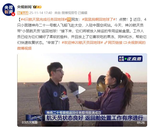 来源:央视新闻 近日,4只小鼠随神舟二十一号载人飞船飞赴太空,入驻中国空间站。今天,神20航天员带"小鼠航天 员"返回地球!"接下来,它们将被放入转运的专用运输盒里。工作人员已经为它们铺好了柔软的垫料, 并且放上了它喜欢吃的果冻、饲料和水,帮助它们快速恢复状态。"辛苦了! 0:00 ...