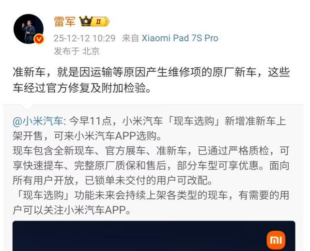 公司动态:小米汽车上线“现车选购”功能 - 小米汽车于12月13日在其官方App上线“现车选购”新增功能 [1] - 该功能推出“准新车”品类供消费者选择,引发市场关注 [1] - “现车选购”功能将持续优化,未来会不断上架各类现车资源以满足消费者多样化需求 [2] 产品与服务细节 - “现车”体系涵盖三大类别:全新现车、官方展车及准新车 [2] - 所有车型均经过严格质量检测,购买后可享受快速提车服务、完整原厂质保及标准化售后服务 [2] - 部分车型附带专属优惠政策 [2] - “准新车”品类面向所有用户开放,已锁单未交付的用户还可享受改配服务 [1] 产品定义与来源 - 小米官方明确说明“准新车”本质为原厂新车,仅因运输等特殊原因产生过维修需求 [2] - 该类车型已完成官方专业修复及额外的售前检验流程,确保车辆品质达标 [2] - 公司创始人雷军回应称,“准新车”概念是沿用同行命名,厘清了该概念的行业通用性 [2]