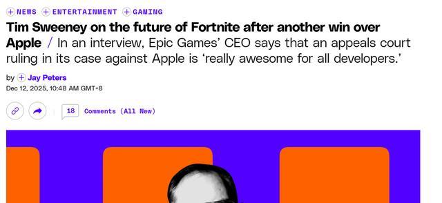 【环球网科技综合报道】12月13日消息,据The Verge报道,Epic Games CEO 蒂姆·斯威尼近日在接受其 采访时明确表态,坚决反对就 iOS 应用外链内购业务向苹果支付收入抽成,即便美国联邦上诉法院已 裁定苹果有权就此类交易收取合理费用。 来源:环球网 针对这一裁定,斯威尼作出回应。他首先承认,苹果在审核外部支付链接过程中会产生相应运营成本, 对于与该审核流程直接相关、按提交次数收取的固定费用,Epic 方面表示可以接受。但他强调,坚决 反对苹果针对 App Store 之外的收入收取按比例计算的抽成费用。 斯威尼进一步指出,本次上诉法院的裁定,本质上是对苹果长期维持的 App Store 抽成模式的明确否 定。他认为,这一裁决"彻底终结了苹果有权向任意应用收取'垃圾费用'的不合理现状"。同时他提到, 美国这一裁决可能会对海外监管机构产生影响,其他地区大概率不会允许苹果收取此类被认定为不合理 的费用。 值得注意的是,上诉法院虽未完全禁止苹果就内购业务收取佣金,但明确表示下级法院"永久禁止所有 佣金"的裁定过于严厉,不符合纠正性措施的初衷,更偏向于惩罚性举措,因此作出了相应修改。(纯 钧) 此前 ...