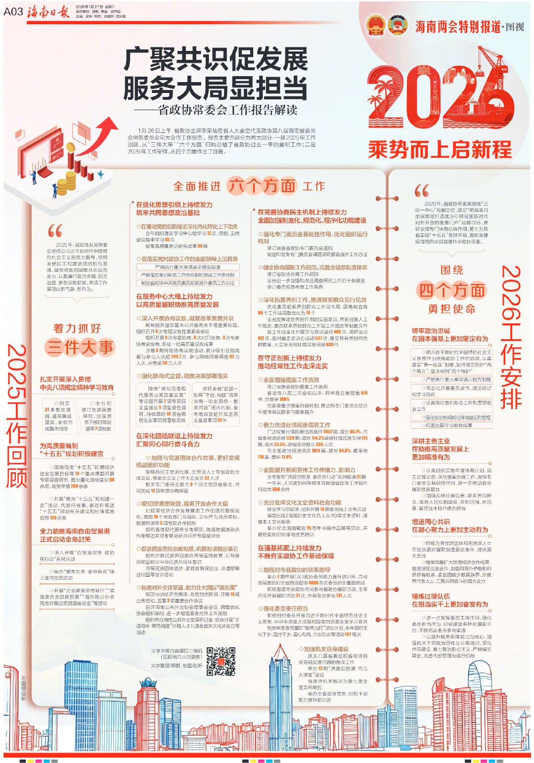 A03 海南日报 1月26日上午,省政协主席李荣灿在省人大会堂代表政协第八届海南省委员 会常务委员会向大会作工作报告。报告主要内容分为两大部分 -- 是2025年工作 回顾,从"三件大事""六个方面"归纳总结了省政协过去一年的履职工作;二是 2026年工作安排,从四个方面作出了部落 全面推进 六个方面 工作 在强化思想引领上持续发力 筑牢共同思想政治基础 (在推动党的创新理论深化内化转化上下功夫 全年组织理论学习中心组学习 移次、党组、中国 会议集中学习 48次 征集高质量理论研究成果 ■ 角 0在落实党对政协工作的全面领导上见真章 严格执行重大事项请示报告制度 严格落实意识形态工作责任制和继战工作责任制 制定省政协中共党员委员联系党外委员工作办法 在服务中心大局上持续发力 以高质量露明助推高质量发展 ○深入开展协商议政,凝聚改革发展共议 聚焦提升垦区基本公共服务水平等重要议题 组织召开 次专题议政性学委会会议 开展 ● 期网络协商议政活动,累计吸引在线观 若与参与人次超265.7万:参与网络问卷调查 82万 人次,点赞逾58万人次 0强化协商式监督,助推决策部署落实 | 国统"推动海南观 依托全省"监督一 ...