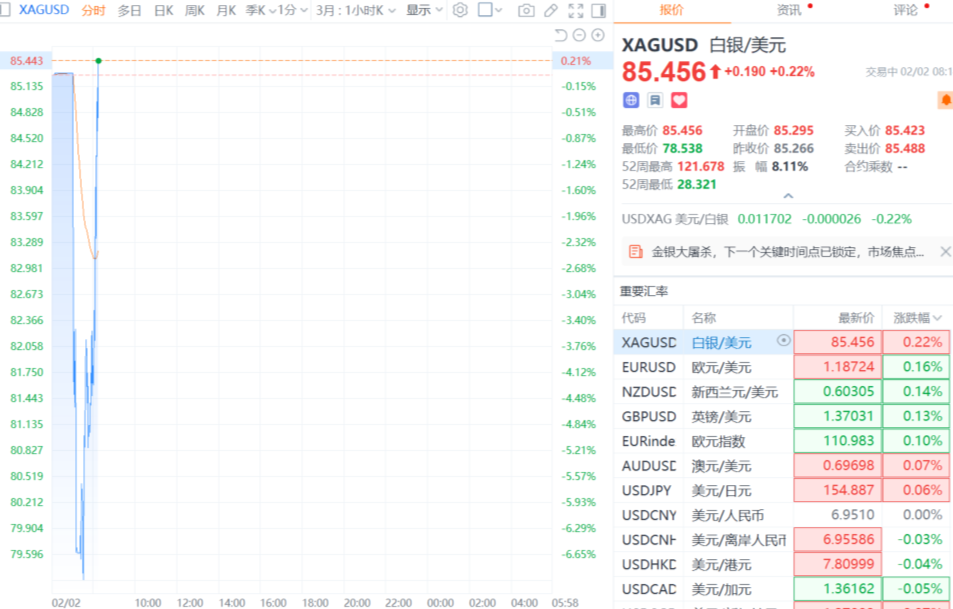 现货白银日内转涨,早盘一度跌超10%,现报85.456美元/盎司。 此前,1月31日,黄金上演史诗级崩盘,盘中最大跌幅突破12%,最终收跌9.25%。白银更惨烈,单日最大跌幅达到36%,最终收跌 26.4%,超过四分之一的市值瞬间蒸发。 金银价暴涨后又暴跌:清醒的头脑比黄金更贵,警惕金市银市那些暴富故事 相关阅读: 金价急跌之下:银行密集提示风险,部分实物金全线售罄 风暴眼丨史诗级崩盘!有人爆仓有人想退货,黄金还香吗? | | | | | [ XAGUSD 分时 多日 日K 周K 月K 学K、1分、3月:1小时K、显示、 ② ○、 ◎ 2 [2 ] | | | | | 报价 | 资讯 · | | 评论 · | | --- | --- | --- | --- | --- | --- | --- | --- | --- | --- | --- | --- | --- | | | | | | | | | | 06G | XAGUSD 白银/美元 | | | | | 85.443 | | | | | | | | 0.21% | 85.456 + +0.190 +0.22% | | | 交易中 02/02 08:1 | ...