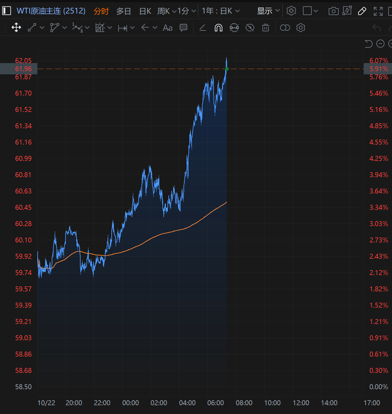10月23日,WTI原油期货涨幅扩大至6%,报62.04美元/桶。布伦特原油涨5.55%,报66.066美元/桶。隔夜,美国财政部长贝森特宣布制裁俄罗斯两大石油企 业;日内,特朗普重申印度将停止购买俄罗斯石油。 | | | | | WTI原油主连 (2512) 分时 多日 日K 周K ~1分 ~ 1年:日K ~ | | | | | 显示 | | | | --- | --- | --- | --- | --- | --- | --- | --- | --- | --- | --- | --- | | | | | | | ア・・ | | | | | | | | 62.05 | | | | | | | | | | | | | 61.96 | | | | | | | | | | | | | 61.87 | | | | | | | | | | | | | 61.70 | | | | | | | | | | | | | 61.52 | | | | | | | | | | | | | 61.34 | | | | | | | | | | | | | 61.16 | | | | | | | | | | | | | 60.99 ...