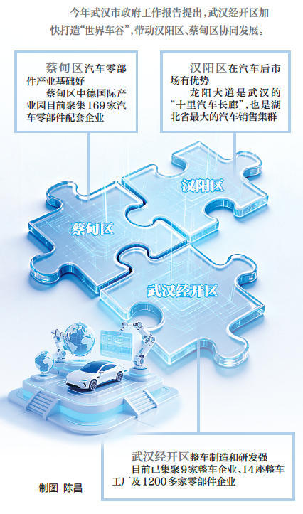 比如创新链服务队,推动成立全市首个科技成果转化中试平台联盟,让创新转换率有效 提升;供应链服务队,就是围绕整车企业开展全链条招商。目前武汉经开区已集聚9家整车 企业、14座整车工厂及1200多家零部件企业。 "在一些具体任务中,我们会联动其他区一起展开工作,这种探索早已开始。"该负责人 说。 最新数据显示,武汉新能源汽车产量占比达到55%,首次超过全国平均水平。这意味 着,武汉的汽车产业实现"油转电"的结构性跨越。 武汉汽车产业未来如何继续做大做强?武汉市提出,支持武汉经开区高水平建设军山新 城,加快打造"世界车谷",带动汉阳区、蔡甸区协同发展。 为何是这三地协同?长江日报记者围绕这个问题问了问三地相关部门,简单概括就是, 三地的产业有互补性——武汉经开区整车制造和研发强,蔡甸的汽车零部件产业基础好,而 汉阳在汽车后市场有优势。 1月4日,新年第一个工作日,武汉经开区就迎来"开门红"签约, 签约项目涵盖智能网 联与电动汽车、汽车零部件、绿色低碳、新材料、智能制造等领域。 2021年起,武汉经开区就成立了一支名为"智链车谷"的团队。区委组织部相关负责人介 绍,这支团队由军山新城、经信、科创、发改、投促等单位党员 ...