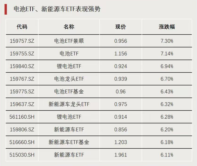 电池与新能源板块市场表现 - 宁德时代A股股价大涨超7%,总市值突破1.9万亿元,带动电池与新能源车板块强势上涨 [1] - 多只电池类ETF涨幅超6%,其中电池ETF(159755)大涨7.14%,今年以来涨幅超77% [3] - 电池ETF(159755)最新规模超150亿元,今年以来资金净买入额达84亿元,是全市场规模最大的电池主题指数基金 [3] - 全市场多只电池类ETF今年以来涨幅达到70% [1] - 具体ETF表现包括电池ETF景顺涨7.30%、锂电池ETF涨6.94%、电池龙头ETF涨6.70%等 [4] - 新能源车ETF同步走强,如新能源车龙头ETF涨6.32%、新能源车ETF涨6.20% [4] 金属主题与相关板块表现 - 受碳酸锂、白银、黄金、铜等金属价格走强推动,多只金属主题类ETF大幅走强,稀有金属ETF(159608)涨超5% [5] - 稀有金属ETF基金涨5.31%,其他稀有金属ETF涨幅在5.10%至5.19%之间 [6] - 创业板新能源ETF、新材料ETF基金等相关板块ETF也录得约4.76%至4.90%的涨幅 [6] - 黄金、科创板、创业板、非银等板块成为资金涌入的重要方向,多只相关主题ETF净流入额超10亿元 [2][9] 债券型ETF市场交易活跃度 - 多只债券型ETF交投活跃,银华日利ETF(511880)成交额184.83亿元,短融ETF(511360)成交额165.87亿元 [7][8] - 科创债ETF国泰(551800)成交额120.19亿元,换手率达114.22% [7][8] - 在成交金额排名前10的ETF中,有4只为科创债主题ETF,显示该板块交易活跃 [7] 行业资金流向 - 本周资金净流入额领先的ETF包括银华日利A(28.09亿元)、华安黄金ETF(20.23亿元)、华夏上证科创板50ETF(19.55亿元) [10] - 易方达创业板ETF净流入12.24亿元,易方达沪深300非银ETF净流入12.03亿元 [10] - 其他获得显著资金流入的板块包括化工、港股通非银行金融、主要消费等 [10] 新能源产业长期发展动力 - 2025世界动力电池大会签约项目180个,总金额达861.3亿元,覆盖动力电池、新型储能、光伏、智能网联新能源汽车等关键领域 [11] - 人工智能算力需求增长对稳定电力供应提出高要求,发电、储能及电网设备等电力产业链环节获市场持续关注 [11] - 新能源车、高端制造等领域对上游原材料需求强劲,稀有金属板块的周期成长属性及配置价值凸显 [11] 机器人产业发展前景 - 人形机器人产业处于从零到一的初级阶段,展现出巨大发展潜力,类似早年新能源产业起步期 [11] - 特斯拉第三代机器人技术方案预计明年上半年落地,将带动整个产业链快速发展 [12] - 国内人形机器人产业同步加速布局和产业化进程,未来有望催生更多投资机会 [12]