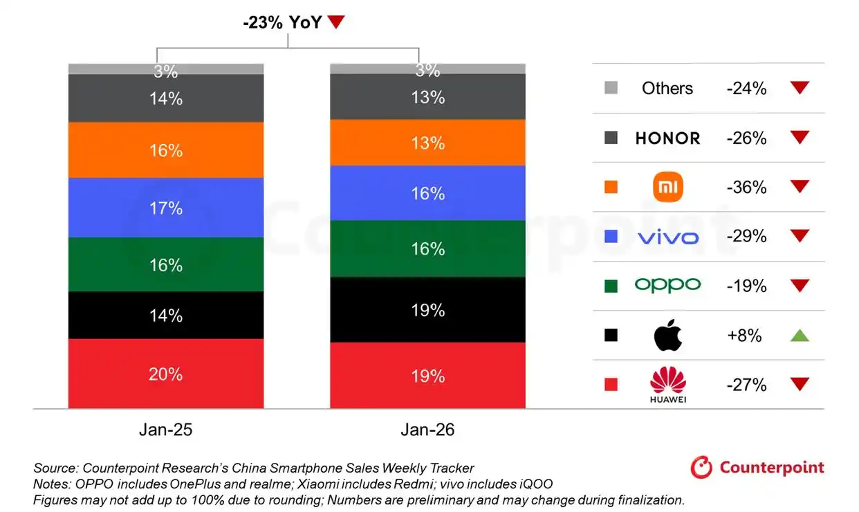 中国智能手机市场2026年1月整体表现 - 2026年1月中国智能手机市场整体销量同比下滑23% [1] - 市场下滑核心原因包括:2025年初补贴政策形成的高基数效应、2026年补贴力度减弱、以及农历新年时间错峰对消费节奏的影响 [1] - 尽管1月市场低迷,但预计2月销量有望随春节季节性消费回升,春节是消费者“换新”“送礼”需求集中释放的关键窗口 [3] 主要厂商市场份额与销量变化 - 华为以19%的市场份额位列第一,但销量同比下滑27% [1] - 苹果销量同比增长8%,市场份额升至近五年1月最高水平,是唯一实现增长的头部品牌 [3] - 其他国产头部品牌均遭遇两位数下滑:小米(含Redmi)下滑36%、vivo(含iQOO)下滑29%、OPPO(含一加、realme)下滑19%、荣耀下滑26%,“Others”品牌下滑24% [3] 华为应对策略 - 为对冲销量压力,华为将重心转向基础款机型,Mate 80成为当月最畅销机型 [1] - 华为推出“以旧换新 + 官方补贴”组合政策,具体措施为回收平台高价评估加上额外20%换新补贴,以稳固销量基盘 [1] 苹果增长驱动因素 - 苹果销量增长得益于iPhone 17系列的持续热度,其标准版符合政府补贴条件,性价比凸显,销量环比增长9% [3] - iPhone 17系列降价幅度较小,为后续利润优化或价格调整预留空间,支撑长期销量韧性 [3] 市场下滑核心症结分析 - 国产头部品牌销量下滑的核心症结在于2025年初补贴政策的“透支效应”,去年1月补贴恰逢春节促销前置了需求 [3] - 2026年补贴力度减弱,消费需求疲软,对销量刺激有限 [3]