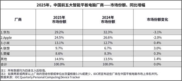 2025年中国平板电脑出货量排名:华为稳居第一 苹果、小米紧随