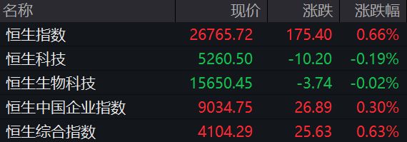 市场主要指数表现 - 香港恒生指数收于26765.72点,上涨175.40点,涨幅0.66% [1][2] - 恒生科技指数收于5260.50点,下跌10.20点,跌幅0.19% [1][2] - 恒生中国企业指数收于9034.75点,上涨26.89点,涨幅0.30% [2] - 恒生综合指数收于4104.29点,上涨25.63点,涨幅0.63% [2] - 恒生生物科技指数收于15650.45点,下跌3.74点,跌幅0.02% [2] 科技与互联网板块个股表现 - 科网股整体呈现高开低走态势 [2] - 商汤-W股价下跌5.36%,收于2.470港元 [3] - 同程旅行股价下跌4.97%,收于21.020港元 [3] - 零跑汽车股价下跌3.71%,收于43.060港元 [3] - 地平线机器人-W股价下跌3.41%,收于8.510港元 [3] - 蔚来-SW股价下跌2.64%,收于40.640港元 [3] - 阿里健康股价下跌2.53%,收于5.790港元 [3] - 百度集团-SW股价下跌0.62%,收于128.900港元 [3] - 网易-S股价下跌0.61%,收于178.300港元 [3] - 快手-W股价下跌0.45%,收于66.350港元 [3] - 小米集团-W股价下跌0.39%,收于35.600港元 [3] GEO概念板块表现 - GEO概念板块震荡回调 [3] - MINIMAX-WP股价大幅下跌14.38%,收于753.500港元 [4] - 智谱股价大幅下跌10.75%,收于560.500港元 [4] - 迅策股价下跌3.72%,收于86.650港元 [4] - 趣致集团股价下跌2.52%,收于23.220港元 [4] - 有赞股价下跌2.21%,收于0.133港元 [4]