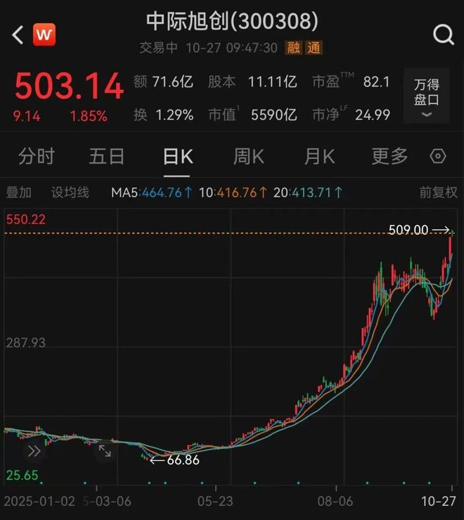 编辑|钉钉 中际旭创股价历史首次突破500元关口,截至发稿,该股涨1.85%,报503.14元/股,成交额超70亿元。 10月27日,A股三大指数高开高走,截至发稿,创业板指涨超2%,算力权重股涨幅居前,仕佳光子涨 超10%,胜宏科技涨超6%。 ...