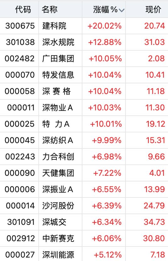 | 代码 | 名称 | 涨幅%v | 现价 | | --- | --- | --- | --- | | 300675 | 建科院 | +20.02% | 20.74 | | 301038 | 深水规院 | +12.88% | 31.03 | | 002482 | 广田集团 | +10.05% | 2.08 | | 000070 | 特发信息 | +10.04% | 10.41 | | 000058 | 深 赛 格 | +10.04% | 11.18 | | 000011 | 深物业A | +10.03% | 11.30 | | 000025 | 特 力A | +10.01% | 19.12 | | 000045 | 深纺织A | +9.99% | 15.31 | | 002243 | 力合科创 | +6.98% | 9.66 | | 000090 | 天健集团 | +7.22% | 4.01 | | 000006 | 深振业A | +6.55% | 13.99 | | 000014 | 沙河股份 | +6.39% | 24.79 | | 301091 | 深城交 | +6.34% | 34.73 | | 00 ...