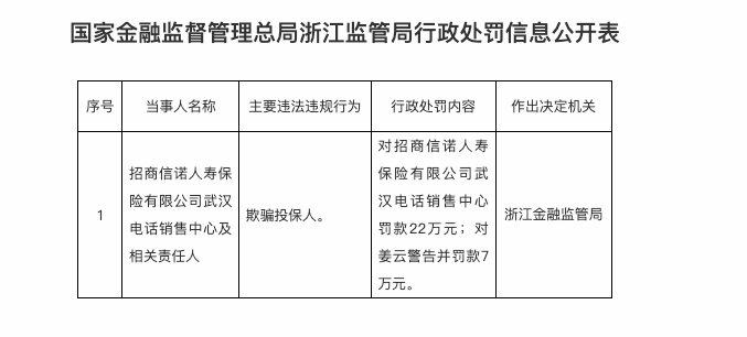 招商信诺人寿武汉电话销售中心被罚款22万元 因欺骗投保人