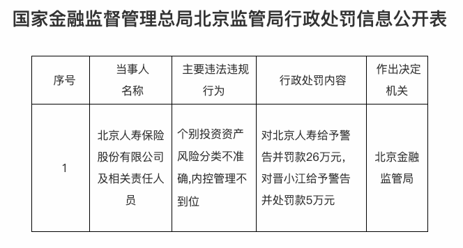 凤凰网财经讯 10月31日,据国家金融监督管理总局官网消息显示,北京人寿因个别投资资产风险分类 不准确,内控管理不到位被罚款26万元。相关责任人晋小江受到警告,并处罚款5万元。 | 序号 | 当事人 | 主要违法违规 | 行政处罚内容 | 作出决定 | | --- | --- | --- | --- | --- | | | 名称 | 行为 | | 机关 | | | 北京人寿保险 | 个别投资资产 | 对北京人寿给予警 | | | | 股份有限公司 | 风险分类不准 | 告并罚款26万元, | 北京金融 | | 1 | 及相关责任人 | 确,内控管理不 | 对晋小江给予警告 | 监管局 | | | 员 | 到位 | 并处罚款5万元 | | 截图:国家金融监督管理总局官网 ...