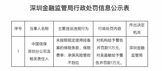 凤凰网财经讯 11月3日,据国家金融监督管理总局官网消息显示,中国信保深圳分公司因未按照规定使 用经备案的保险条款、保险费率,承保风险管控不到位被罚款11万元,相关责任人吴晶敏受到警告并被 罚款1万元。 | 序号 | 当事人名称 | 主要违法违规行为 | 行政处罚内容 | 作出决定 | | --- | --- | --- | --- | --- | | | | | | 机关 | | | 中国信保 | 未按照规定使用经备 | 对机构给予警告 | | | 1 | 深圳分公司及 | 案的保险条款、保险 | 并罚款11万元, | 深圳金融 | | | 相关责任人 | 费率;承保风险管控 | 对吴晶敏给予警 | 监管局 | | | | 不到位 | 告并罚款1万元。 | | 截图:国家金融监督管理总局官网 ...