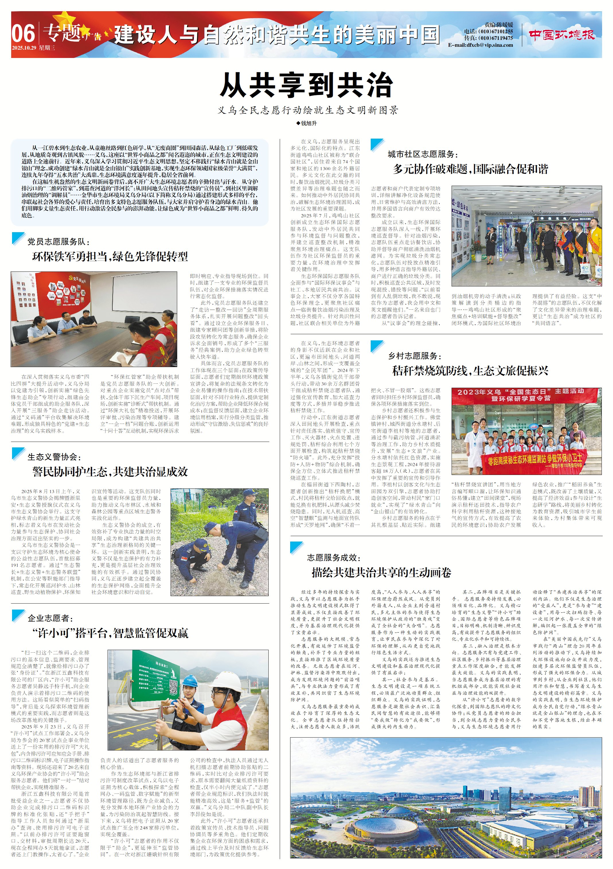 从一江碧水到生态农业,从童趣丝路到红色研学,从"无废商圈"到田园森活,从绿色工厂到低碳发展,从地质奇观到古镇风貌……义乌,这座以"世界 小商品之都"闻名遐迩的城市,正在生态文明建设的道路上全速前行。近年来,义乌深入学习贯彻习近平生态文明思想,坚定不移践行绿水青山就是金山银 山理念,成功创建"绿水青山就是金山银山"实践创新基地,实现生态环保领域国家级荣誉"大满贯",连续九年夺得"五水共治"大禹鼎,生态环境满意度逐年 提升,稳居全省前列。 在这幅生机盎然的生态文明新画卷背后,离不开广大生态环境志愿者的辛勤付出与汗水。从守护排污口的"二维码管家",到巡查河道的"洋河长";从田 间地头宣传秸秆禁烧的"宣传员",到社区里调解油烟治理的"调解员"……金华市生态环境局义乌分局(以下简称义乌分局)通过搭建形式多样的平台,串联 起社会各界的爱心与责任,培育出多支特色志愿服务队伍,与大家并肩守护着身边的绿水青山。他们用脚步丈量生态责任,用行动激活全民参与的澎湃动 能,让绿色成为"世界小商品之都"鲜明、持久的底色。 环保铁军勇担当,绿色先锋促转型 在深入贯彻落实义乌市委"四比四拼"大提升活动中,义乌分局以党建为引领,创新实施"绿色 ...
