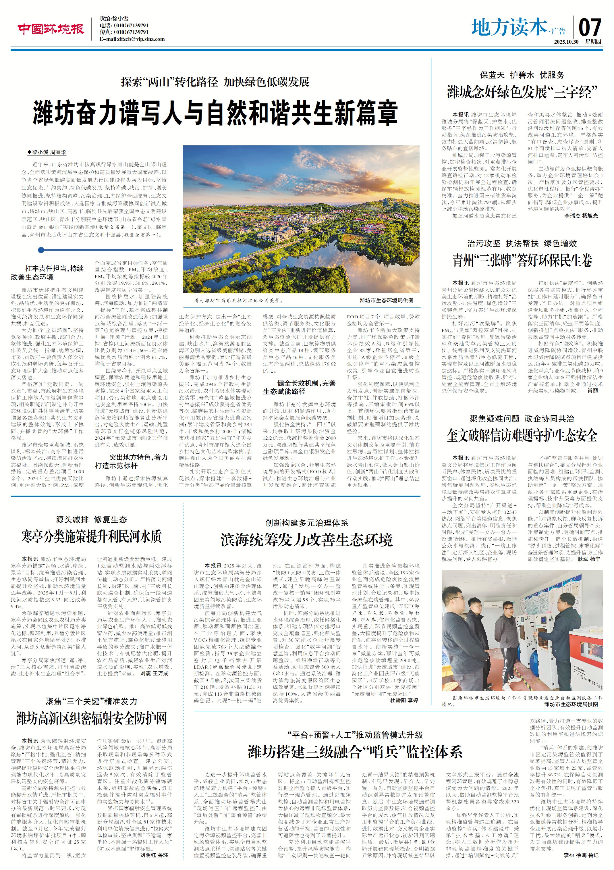 责编:徐小雪 电话:(010)67139791 传真:(010)67139791 E-mail:dfxcb@vip.sina.com 探索"两山"转化路径 加快绿色低碳发展 潍坊奋力谱写人与自然和谐共 ◆梁小溪 周丽华 近年来,山东省潍坊市认真践行绿水青山就是金山银山理 念,全面落实黄河流域生态保护和高质量发展重大国家战略,以 争当全省绿色低碳高质量发展先行区建设排头兵为目标,坚持 生态优先、节约集约、绿色低碳发展,坚持降碳、减污、扩绿、增长 协同推进,坚持结构调整、污染治理、生态保护全面统筹,生态文 明建设取得积极成效,人选国家首批减污降碳协同创新试点城 市,诸城市、峡山区、高密市、临朐县先后荣获全国生态文明建设 示范区,峡山区、青州市分别获生态环境部、山东省命名"绿水青 山就是金山银山"实践创新基地(数量全省第一),奎文区、临朐 县、青州市先后获评山东省生态文明十强县(数量全省第一)。 扛牢责任担当,持续 改善生态环境 潍坊市始终把生态文明建 设摆在突出位置,锚定建设实力 强、品质优、生活美的更好潍坊, 把良好生态环境作为应有之义, 推动经济发展和生态环保同频 共振、相互促进。 大力推行"全员环保",坚持 ...