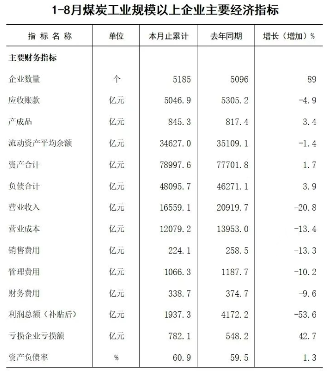 2025年1-8月煤炭工业规模以上企业主要经济指标