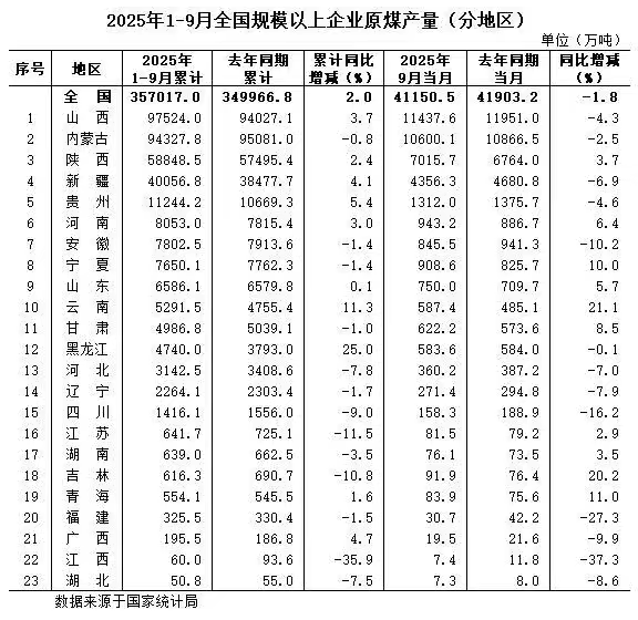 数据来源于国家统计局 2025年1-9月全国规模以上企业原煤产量(分地区) 单位(万吨) 去年同期 同比增填 2025年 去年同期 累计同比 2025年 序号 梅区 1-9月累计 器计 增减(*) 9月当月 3月 ( % ) र्क E 357017.0 349966.8 2.0 41150.5 41903.2 -1.8 山 西 97524.0 94027.1 3.7 11437.6 11951.0 -4.3 1 内蒙古 94327.8 95081.0 -0.8 10866.5 -2.5 2 10600. 1 3 阵 西 58848.5 57495.4 2. 4 7015. 7 6764.0 3.7 新 疆 40056.8 38477.7 4.1 4356. 3 र्वे 4680.8 -6.9 5 贵 11244.2 10669. 3 5.4 1312.0 1375.7 -4.6 河 6 層 8053.0 7815. 4 3.0 943.2 886. 7 6.4 安 7 徽 7802.5 7913.6 -1.4 845.5 941.3 -10.2 宁 量 8 7650.1 7762.3 -1.4 908.6 ...