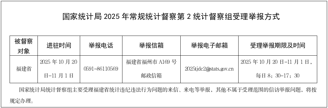 | 被督察 | 进驻时间 | 举报电话 | 挙报信箱 | 举报电子邮箱 | 受理举报期限及时间 | | --- | --- | --- | --- | --- | --- | | 对象 | | | | | | | 福建省 | 2025 年 10月 20 | 0591-86110569 | 福建省福州市 A169 号 | 2025tjdc2@stats.gov.cn | 2025年10月20日-11月1日, | | | 日-11 月 1 日 | | 邮政信箱 | | 每日 8: 30-17: 30 | | | | | 国家统计局统计督察组主要受理福建省统计违纪违法行为问题的来信、来电等举报,其他不属于受理范围的信访举报问题,将按 | | | | 规定办理。 | | | | | | 为深入贯彻落实习近平总书记关于统计工作的重要讲话和重要指示批示精神,根据党中央和国务院授权,国家统计局2025年常规统计督察第2统计督察组日 前进驻福建省开展统计督察工作,实地督察时间13天左右。 ...