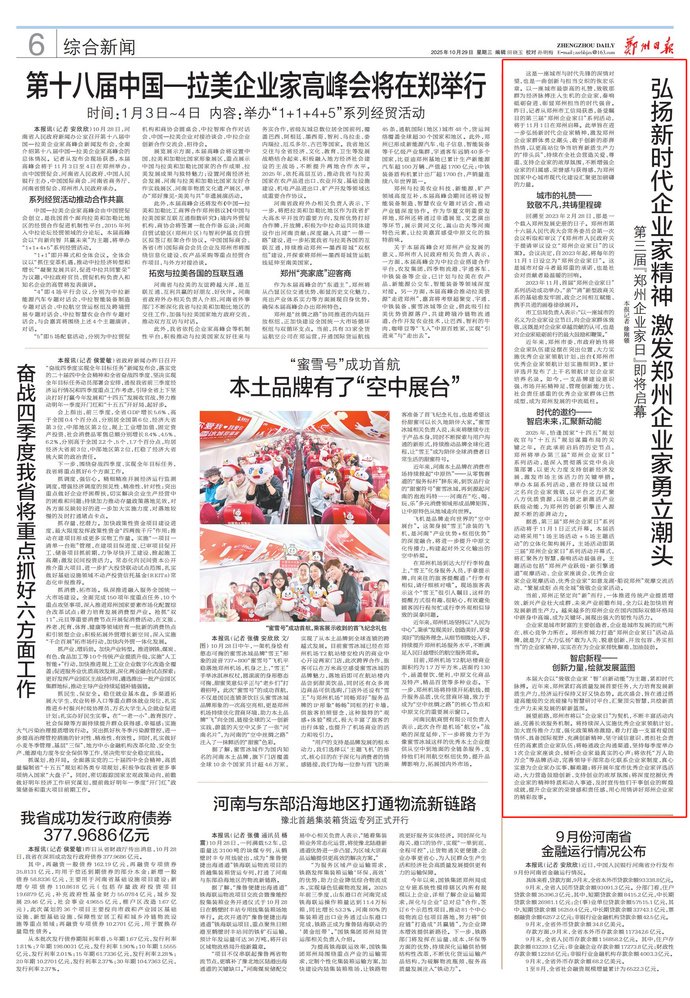 中国—拉美企业家高峰会由中国贸促会创立,是我国首个面向拉美和加勒比地区的经贸合作促进机 制性平台,2015年列入中拉论坛经贸领域的分论坛。本届高峰会以"向新向智 共赢未来"为主题,将举 办"1+1+4+5"系列经贸活动。 "1+1"即开幕式和全体会议。全体会议以"抓住变革机遇,推动中拉经济转型和增长""凝聚发展共 识,促进中拉共同繁荣"为议题,中拉政府官员、贸促机构负责人和知名企业的高管将发表演讲。 10月28日,河南省人民政府新闻办公室召开第十八届中国—拉美企业家高峰会新闻发布会,全面介 绍第十八届中国—拉美企业家高峰会的总体情况。记者从发布会现场获悉,本届高峰会将于11月3日至4 日在郑州举办,由中国贸促会、河南省人民政府、中国人民银行主办,中国国际商会、河南省商务厅、 河南省贸促会、郑州市人民政府承办。 系列经贸活动推动合作共赢 "4"即4场平行会议,分别为中拉新能源汽车专题对话会、中拉智能装备制造专题对话会、中拉航空 货运枢纽及跨境贸易专题对话会、中拉智慧农业合作专题对话会,与会嘉宾将围绕上述4个主题演讲、 对话。 "5"即5场配套活动,分别为中拉贸促机构和商协会圆桌会、中拉智库合作对话会、中国—拉美 ...