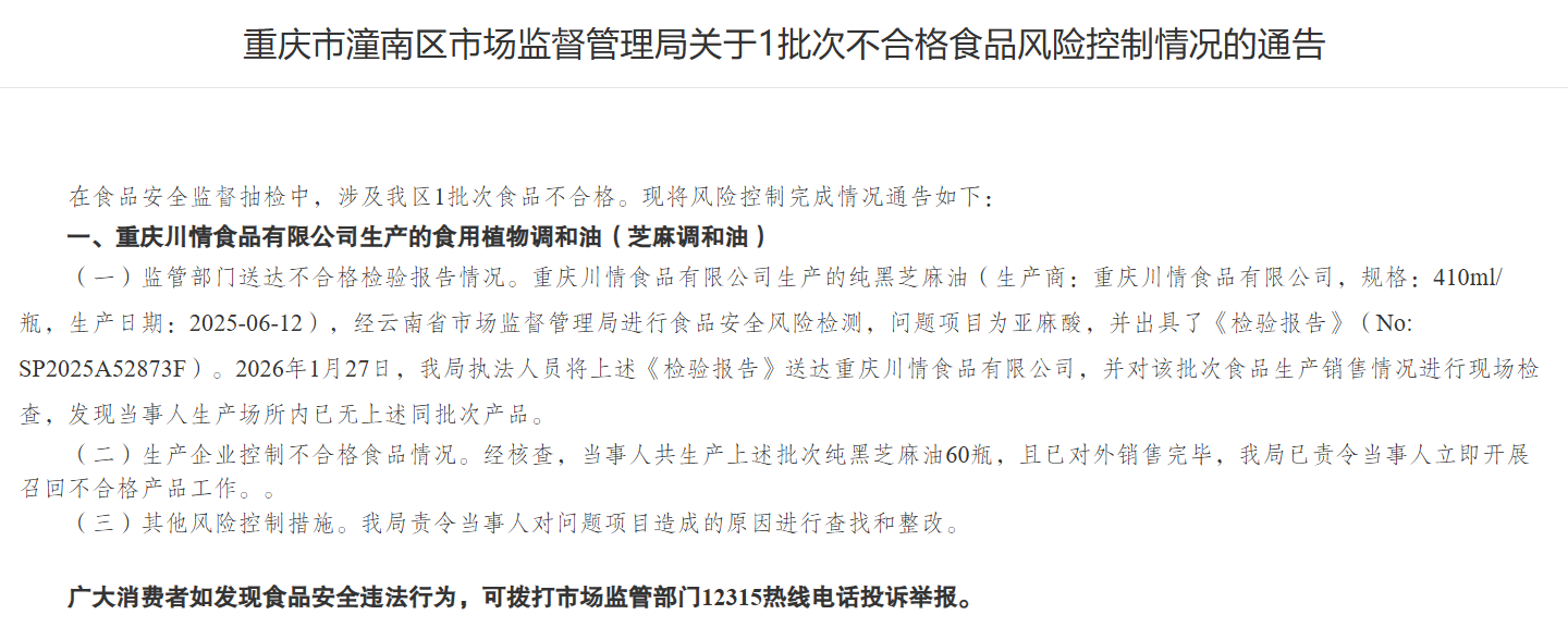 食品安全监管事件 - 重庆市潼南区市场监督管理局通告了1批次不合格食品的风险控制完成情况 [2] - 不合格产品为重庆川情食品有限公司生产的纯黑芝麻油 规格为410ml/瓶 生产日期为2025年6月12日 [2] - 该批次产品经云南省市场监督管理局检测 问题项目为亚麻酸 检验报告编号为No: SP2025A52873F [2] 涉事公司及产品情况 - 涉事公司为重庆川情食品有限公司 [2] - 该公司共生产该批次不合格纯黑芝麻油60瓶 且已全部对外销售完毕 [2] - 监管部门现场检查时 公司生产场所内已无上述同批次产品库存 [2] 监管措施与处置 - 潼南区市场监督管理局于2026年1月27日将不合格检验报告送达该公司并进行了现场检查 [2] - 监管部门已责令该公司立即开展不合格产品召回工作 [2] - 监管部门同时责令该公司对问题项目产生的原因进行查找和整改 [2]