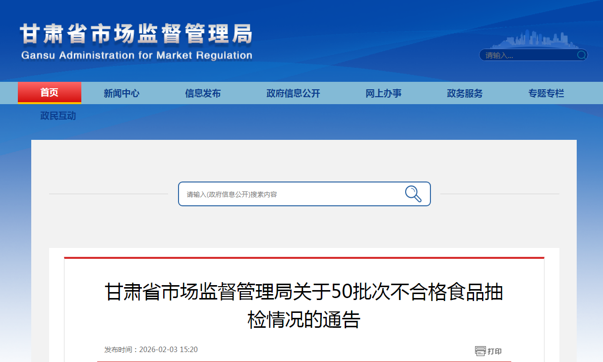 甘肃省市场监督管理局关于50批次不合格食品抽检情况的通告 甘市监通告〔2026〕1期