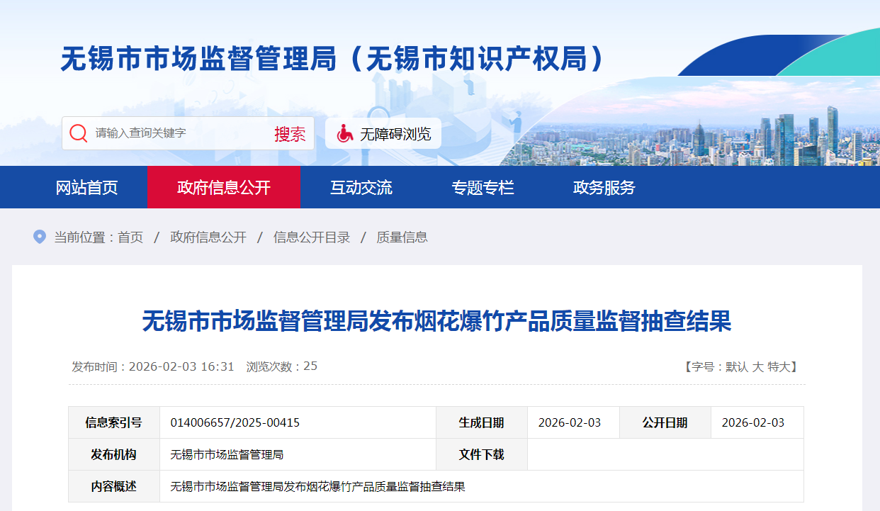 江苏省无锡市市场监督管理局发布烟花爆竹产品质量监督抽查结果