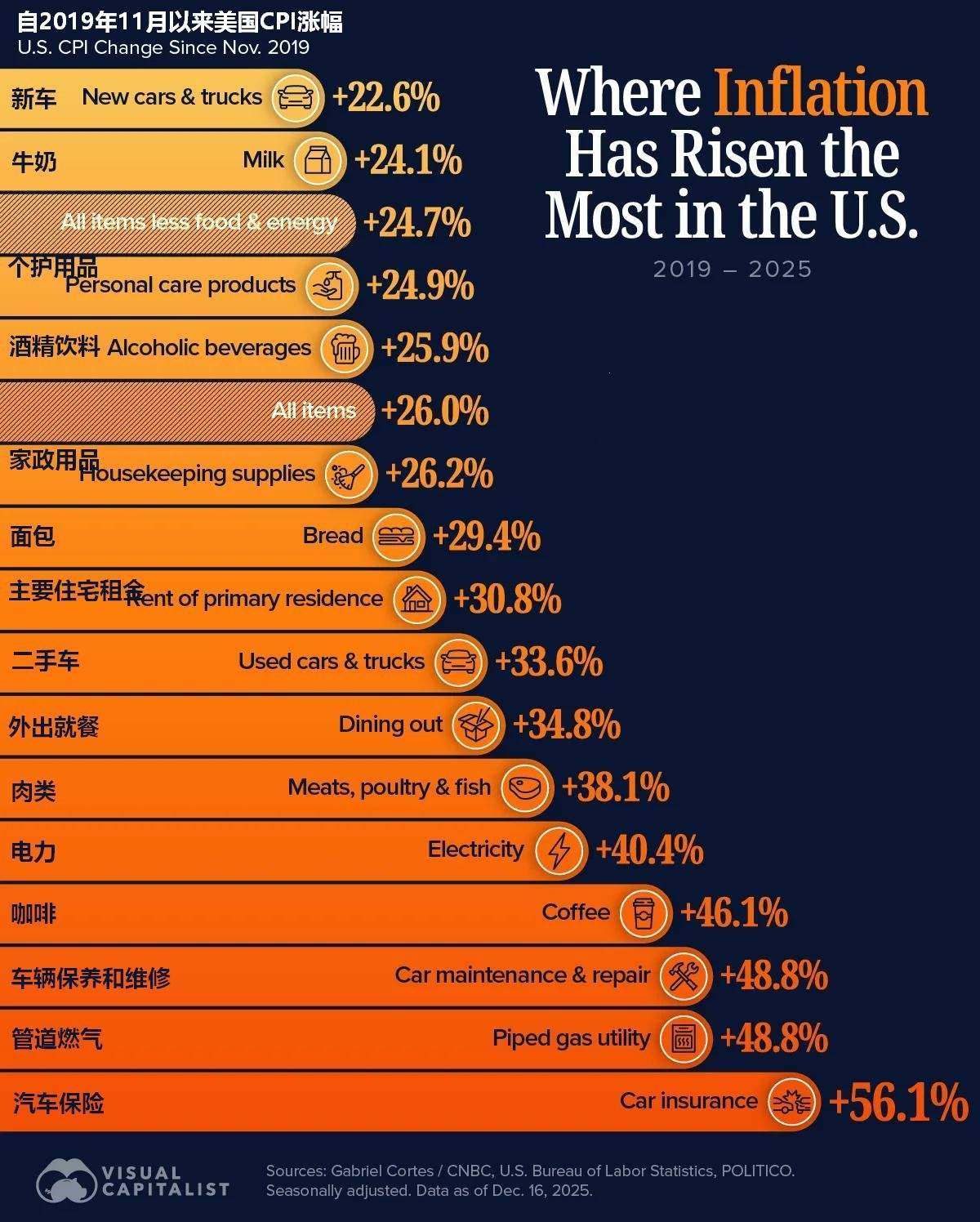 过去5年美国整体物价上涨26%!汽车保费涨幅56.1%居首,燃气价格涨48.8%,电价涨超40%,外出就餐价格涨近35%