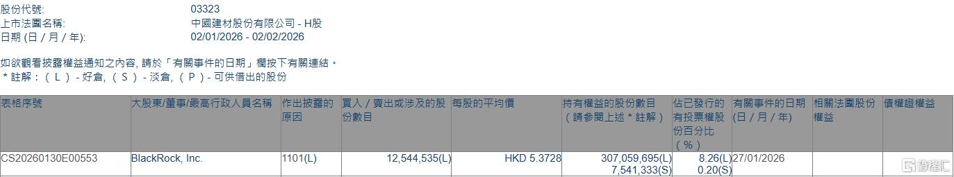 中国建材(03323.HK)获贝莱德增持1254.45万股