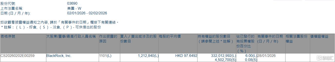 美团-W(03690.HK)获贝莱德增持121.28万股
