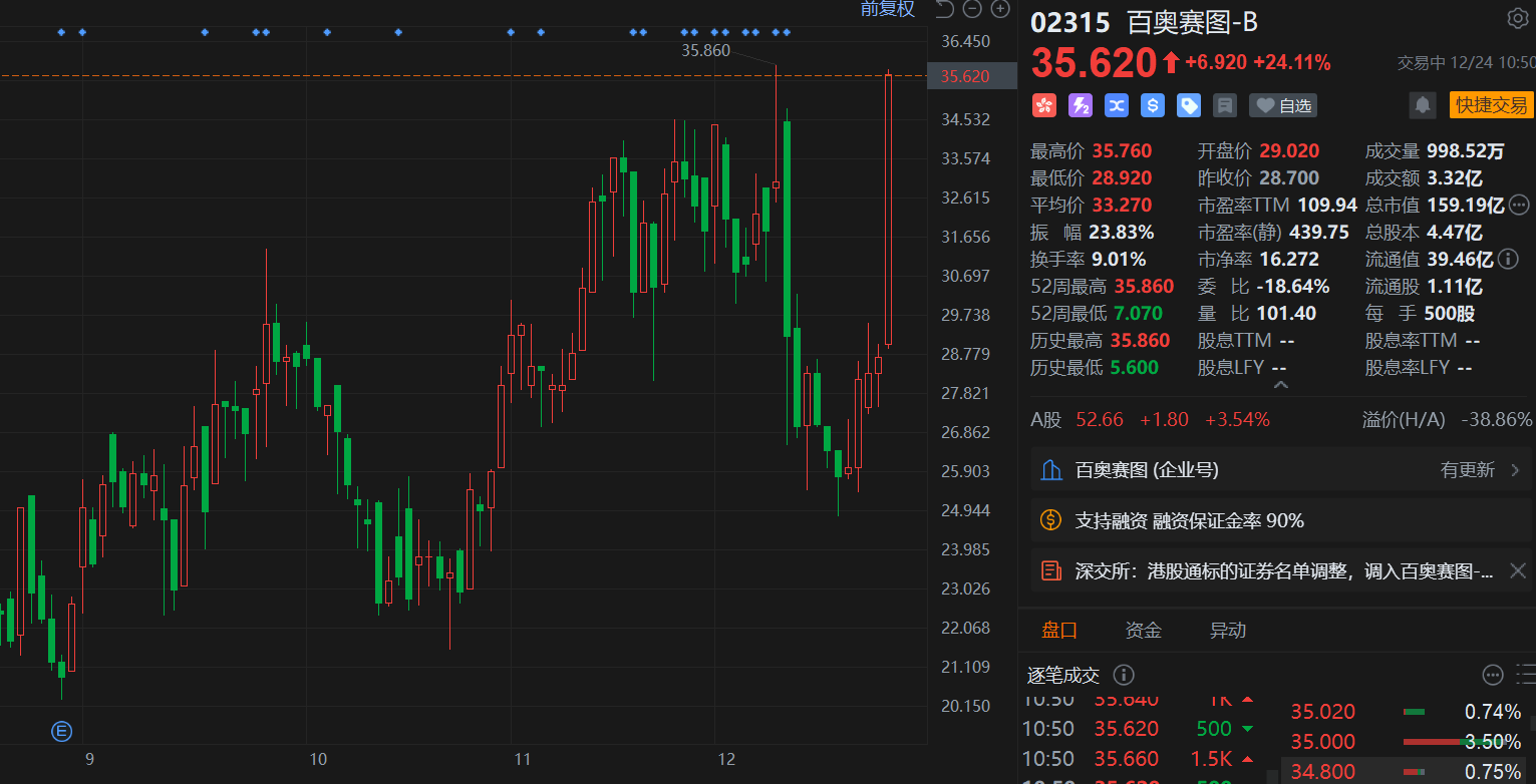 港股异动丨百奥赛图-B劲升超24%,有望刷新历史高价,调入港股通今日起生效