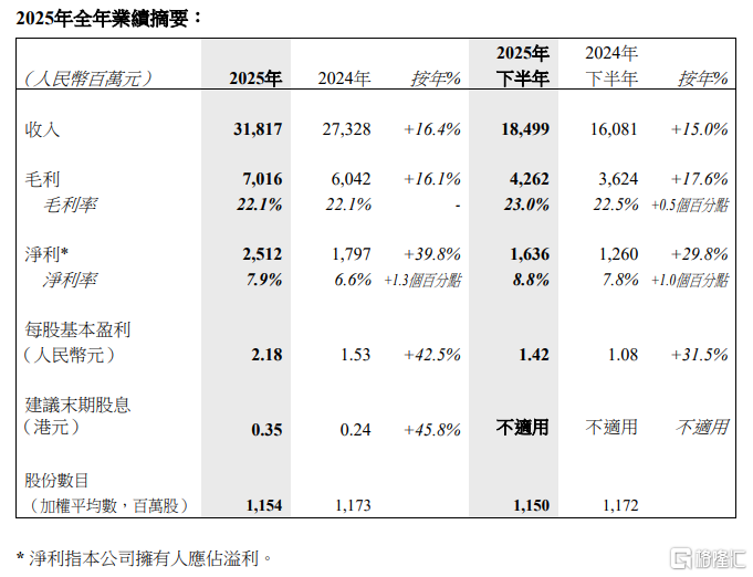 核心财务表现 - 2025年全年实现营业收入318.2亿元人民币,同比增长16.4%,营收规模连续多年刷新历史纪录 [1][3] - 归母净利润同比大增39.8%至25.1亿元人民币,净利增速显著高于营收增速 [2][3] - 全年毛利达到70.2亿元,毛利率稳定维持在22.1% [2][3] - 净利率为7.9%,较上年的6.6%提升1.3个百分点 [2] - 每股基本盈利为人民币2.18元,同比增长42.5% [2] - 建议末期股息为每股0.35港元,同比增长45.8% [2] - 全年经营性现金流达71.8亿元,同比增长38.1% [3] 业务板块表现 - 电磁传动及精密结构件业务作为第一大营收支柱,全年收入突破206.4亿元,依托线性马达市占率提升及VC散热板等创新产品放量,毛利率稳步提升 [4][5] - 传感器及半导体业务全年收入79.7亿元,受益于AI智能硬件需求爆发,高规格麦克风、MEMS传感器等产品在AI眼镜、智能终端出货量激增 [4][5] - 光学业务全年收入72.5亿元,高端镜头、光学模组出货量攀升,WLG工艺产品量产突破,7P镜头、潜望式模组、OIS模组等高端产品占比提升,带动板块盈利能力显著改善 [4][5] - 车载及消费声学产品全年收入57亿元,依托车载声学一体化方案落地及海外并购协同,成功跻身全球头部车载音频供应商阵营 [4][5] 增长驱动与战略转型 - 净利润大幅增长的核心驱动来自光学业务盈利性持续改善,以及电磁传动、车载声学等高盈利水平业务的收入快速增长 [3] - 公司从传统元器件厂商向AI感知基础设施构建者转型,持续加大研发投入,聚焦智能座舱、XR设备、机器人、数据中心散热等高增长赛道 [6] - 散热业务迎来爆发式增长,VC均热板、液冷产品在消费电子、AI服务器领域广泛应用 [6] - 机器人灵巧手、车载声学系统、高端光学镜头等创新产品批量落地,绑定头部客户资源 [6] - 业绩增长得益于消费电子行业复苏、AI硬件需求爆发的行业红利,以及公司技术积淀、业务多元化布局和精益化运营的核心竞争力 [6]