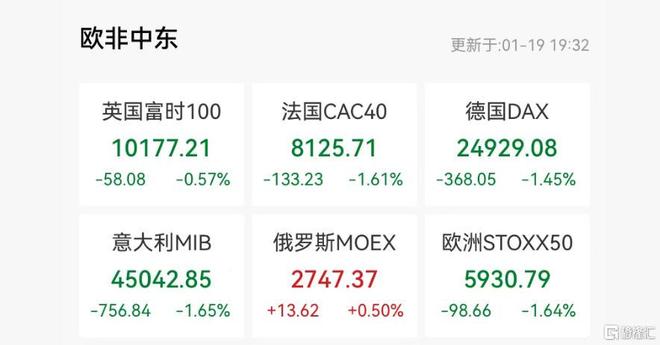 特朗普关税胁迫欧洲8国,正成为压垮跨大西洋关系的最后一根稻草。 欧美关税战重燃之际,欧洲股市周一全线杀跌。 截至发稿,意大利富时MIB指数现跌1.65%,欧洲斯托克50指数跌1.64%,法国CAC40指数跌1.61%,德 国DAX指数跌1.45%,英国富时100指数跌0.57%。 欧洲汽车、奢侈品巨头们股价大幅下跌。 梅赛德斯-奔驰集团在法兰克福市场一度下跌多达6.7%,宝马集团下跌了7%,大众集团则下跌了5.4%。 在法兰克福上市的美国科技巨头股票也纷纷下跌,英伟达、微软和Alphabet等下跌超2%。 美欧"关税战"重燃 因为格陵兰岛,特朗普和欧洲多国又"打"起来了。 周末,特朗普突然宣布对欧洲8国加征关税。 美国将从2月1日起对丹麦、挪威、瑞典、法国、德国、英国、荷兰和芬兰出口至美国的所有商品加征 10%关税。 自2026年6月1日起,加征关税的税率将提高至25%。 川普称,加征关税旨在回应英国、荷兰和芬兰等国官员近期访问格陵兰,以及相关国家整体反对美国购 买该岛的立场。 他指出,格陵兰岛在美国"金穹"导弹防御体系中具有重要战略意义。 关税措施将持续实施,直至就"完全、彻底购买格陵兰岛"达成协议。 更讽 ...