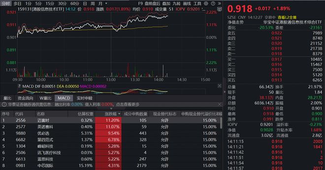 数据来源:中证指数公司,沪深交易所。 12月30日午后,港股硬科技逆市走高,迈富时、英诺赛科涨超11%,优必选涨超9%,第四范式涨超 6%,中芯国际大涨超4%。全市场首只聚焦"港股芯片"产业链的港股信息技术ETF(159131)午后震荡 走高,现涨1.89%,实时成交额超5700万元。 | | | 分时 $日 1分 5分 15分 30分 60分 日 周 月 * | | | | F9 盘前盘后 最加 九和 画线 工具 (2 ) | | | | | | | --- | --- | --- | --- | --- | --- | --- | --- | --- | --- | --- | --- | | 0.92 | | | | 159131[悲股德奥技术ETF] 14:12 价 0.918 涨跌 0.017(1.89%) 均价: 0.910 成交量: 51 IOPV 0.9201 1. | | | | | | 0 91 8 +0.017 +1.89% | | | | | | | | A . A | | | | | SZSE CNY 14:12:27 交易中 查看L2全覆 | | | 0911 | | | | | ...