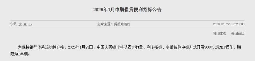 银行频道更多独家策划、专家专栏,免费查阅>> 责任编辑:钟离 据中国人民银行官网发布公告显示,为保持银行体系流动性充裕,2026年1月23日,央行将以固定数量、利率招标、多重价 位中标方式开展9000亿元1年期中期借贷便利(MLF)操作。Wind数据显示,本月有2000亿元MLF到期,此次操作后将实现 7000亿元净投放,这也是央行连续11个月加量续作MLF,凸显货币政策延续支持性立场,助力稳定市场资金面。 ...