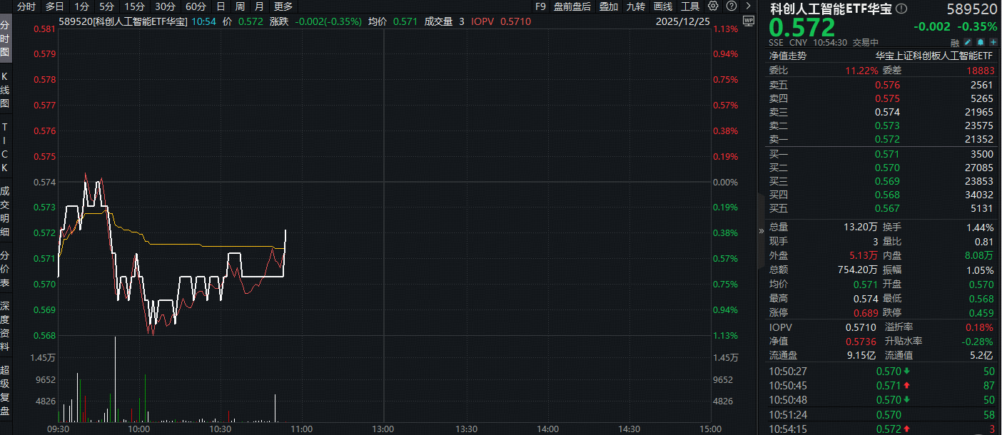 12月25日早盘,市场盘整,重点布局国产AI产业链的科创人工智能ETF(589520)随市回调,场内价格现跌0.35%,值得关注的是,该ETF场内溢价频现, 显示买盘资金更为强势,或有资金逢跌进场布局! | 序号 名称 | | 涨跌幅 ▼ 两日图 | 申万一级行业 | 申万二级行业 | 申万三级行业 | 总市值 | 成交额 | | --- | --- | --- | --- | --- | --- | --- | --- | | 12 | 中科是图 | 3.92% Career of the control of the control of the control of the controlled | 计算机 | IT服务II | IT服务Ⅲ | 407亿 | 8.21亿 | | 2 | 是环科技-U | 2.43% J | 计算机 | 软件开发 | 横向通用软件 | 128亿 | 5.62 Z | | 3 | 奥比中光-UW | 1.85% num | 电子 | 光学光电子 | 光学元件 | 332 Z | 2.54 Z | | ব | 云天励飞-U | 1.24% - | 计算机 | IT服务II | ...