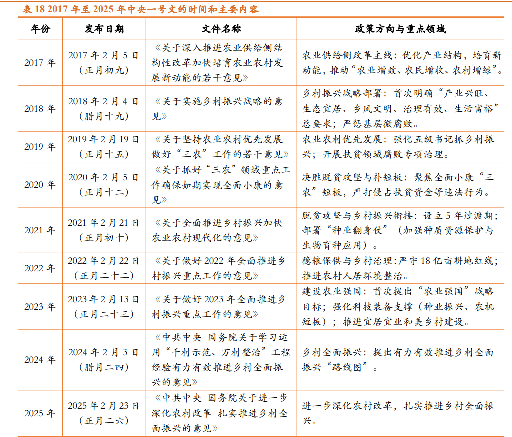 一、事件:一号文件发布 中央一号文件是中共中央年度首份文件,其核心功能是确立全年"三农"工作的纲领性指导;从2017年以来的1号文的发布时间来看,多数集中在春节 前后。 | | れ 10 2017 十三 2020 十十大 ラス昭 開 同代エディ谷 | | | | --- | --- | --- | --- | | 年份 | 发布日期 | 文件名称 | 政策方向与重点领域 | | | 2017年2月5日 | 《关于深入推进农业供给侧结 | 农业供给侧改革主线:优化产业结构,培育新 | | 2017 年 | (正月初九) | 构性改革加快培育农业农村发 | 动能,推动"农业增效、农民增收、农村增绿"。 | | | | 展新动能的若干意见》 | | | | 2018年2月4日 | 《关于实施乡村振兴战略的意 | 乡村振兴战略部署:首次明确"产业兴旺、 | | 2018 年 | (腊月十九) | 见》 | 生态宜居、乡风文明、治理有效、生活富裕" | | | | | 总要求;严惩基层微腐败。 | | 2019 年 | 2019年2月19日 | 《关于坚持农业农村优先发展 | 农业农村优先发展:强化五级书记抓乡村振 | ...